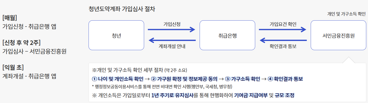 매월 가입신청을 취급은행 앱에서 받고 있으며 신청 후 약 2주정도 가입심사기간을 거친 후 조건이 부합할 경우 익월 초에 계좌개설이 가능합니다.