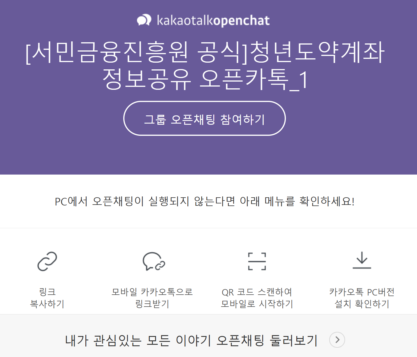 서민금융진흥원에서 청년도약계좌 관련 공식 카카오톡 오픈채팅방을 운영중이니 추가 문의하실 내용이 있으신 경우 아래의 홈페이지에서 참여하실 수 있습니다.